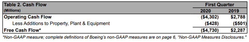 20년 1분기 보잉의 잉여현금흐름은 -47.3억달러입니다. 737MAX 폭망으로 영업활동현금흐름이 큰폭으로 하락한 것이 문제였죠.
