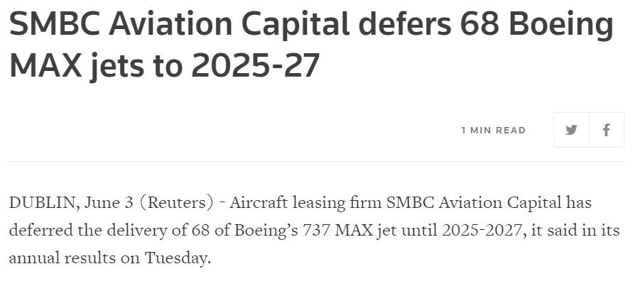 737 MAX 주문취소량이 폭발적으로 늘기 시작했던 2월, 3월, 4월과는 달리 5월에는 주문취소 대수가 확연히 감소한 것을 알 수 있습니다. 거기에다가 SMBC Aviation Capital, TUI Group 등 주요 고객사들이 주문을 취소하지 않고 미룬다고 발표한 점도 보잉 실적회복에 긍정적인 시그널이죠.