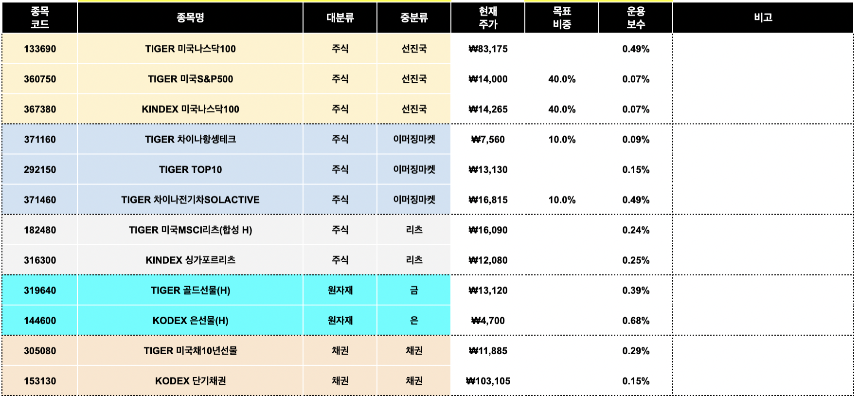 그렇기 때문에 서대리는 나스닥ETF를 함께 가져가는 투자를 하고 있습니다. 대신 연평균 수익률 목표가 10% 정도이기 때문에 나스닥ETF의 비중을 크게 잡을 필요가 없죠. 연금저축펀드를 시작할 초반에는 무조건 기승전 "나스닥"을 외치면서 나스닥 중심의 포트폴리오를 짰지만 지금처럼 방향과 목표가 세팅되고 나니 나스닥ETF 비중을 무작정 늘릴 필요가 없다는 사실을 깨닫게 되었습니다.
