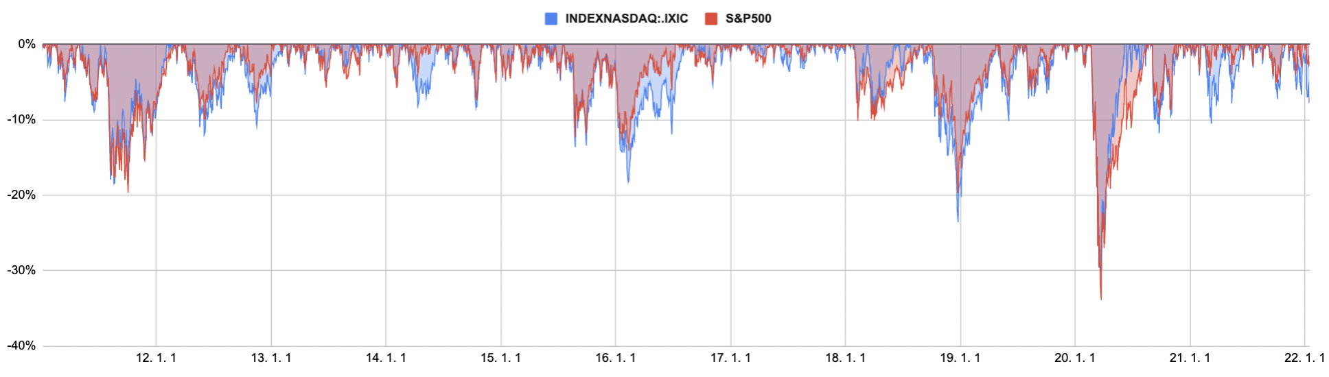 물론 근 10년 간의 MDD를 살펴보면 빅테크 기업들의 압도적인 영향력에 힘입어 나스닥과 S&P500의 변동폭이 큰 차이가 없어지고 있는 상황입니다. 아무래도 S&P500 안에 기술주 비중이 늘어나면서 비슷한 움직임을 보이는 것으로 보입니다. 그래도 기본적으로 나스닥ETF가 기대수익률이 높은 만큼 변동성도 크다고 생각해서 투자할 때 미리 각오(?)를 다지면 좋을 것 같습니다.