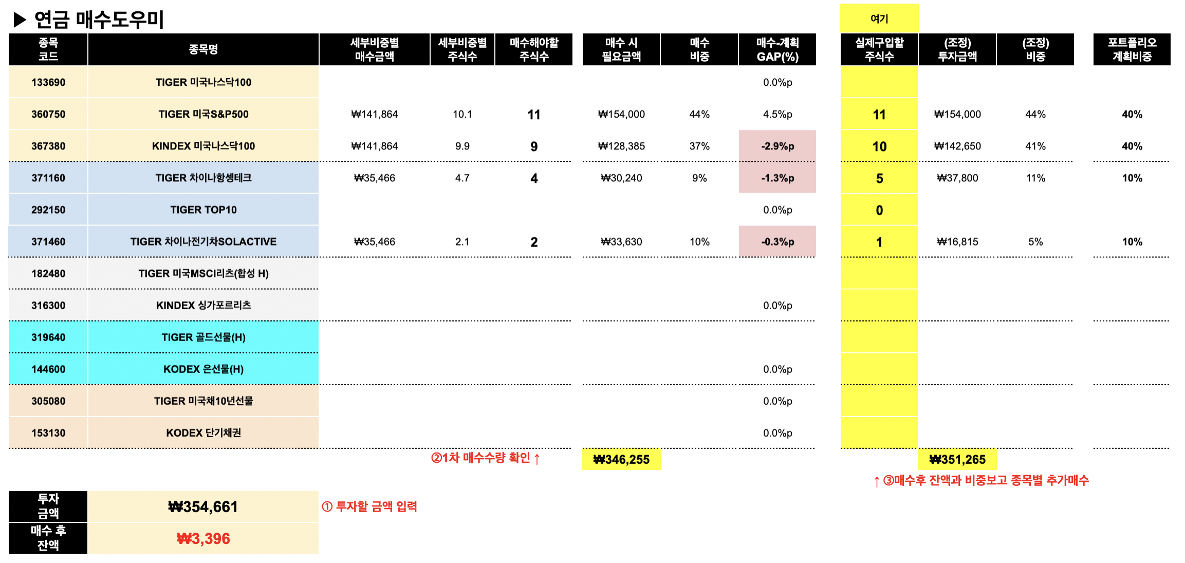 우선 서대리의 경우, S&P500과 나스닥을 1:1 비중으로 투자하고 있습니다. 매달 35만원씩 투자하는 연금저축펀드의 경우, 이전에 공유했던 ETF매수도우미를 활용하여 이 비중대로 ETF들을 매달 매수합니다.