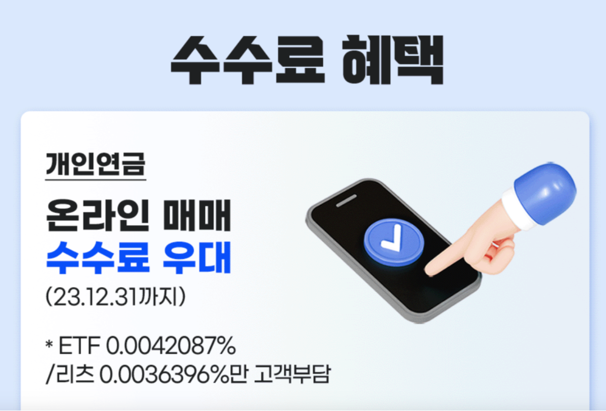 여길 들어가서 쭉 살펴보다보면 스마트폰 비대면 계좌개설 시, ETF와 리츠 거래수수료가 0.0036396%라고 적혀있습니다. 연금저축펀드 1년 세액공제 한도인 600만원 전부 ETF를 매수한다면 거래수수료는 약 218원으로 매우 좋은 조건이죠.