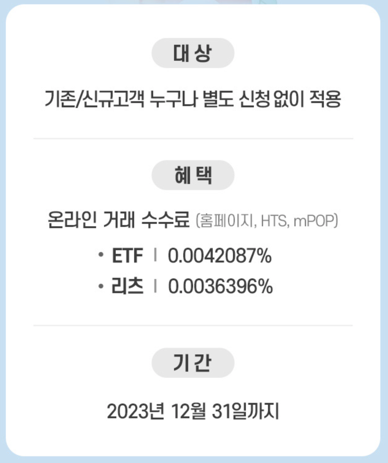 다만 키움증권이나 한국투자증권, 나무증권은 이벤트 종료 후 기본 거래수수료를 정확히 확인할 수는 없었지만 기본적으로 연금저축펀드 수수료는 일반계좌 국내상장 ETF 거래수수료와 동일하다고 합니다. 그래서 증권사에서 연금저축펀드 이벤트를 하고 있지 않거나 따로 언급한 내용이 없다면 일반계좌 수수료를 살펴보면 됩니다.