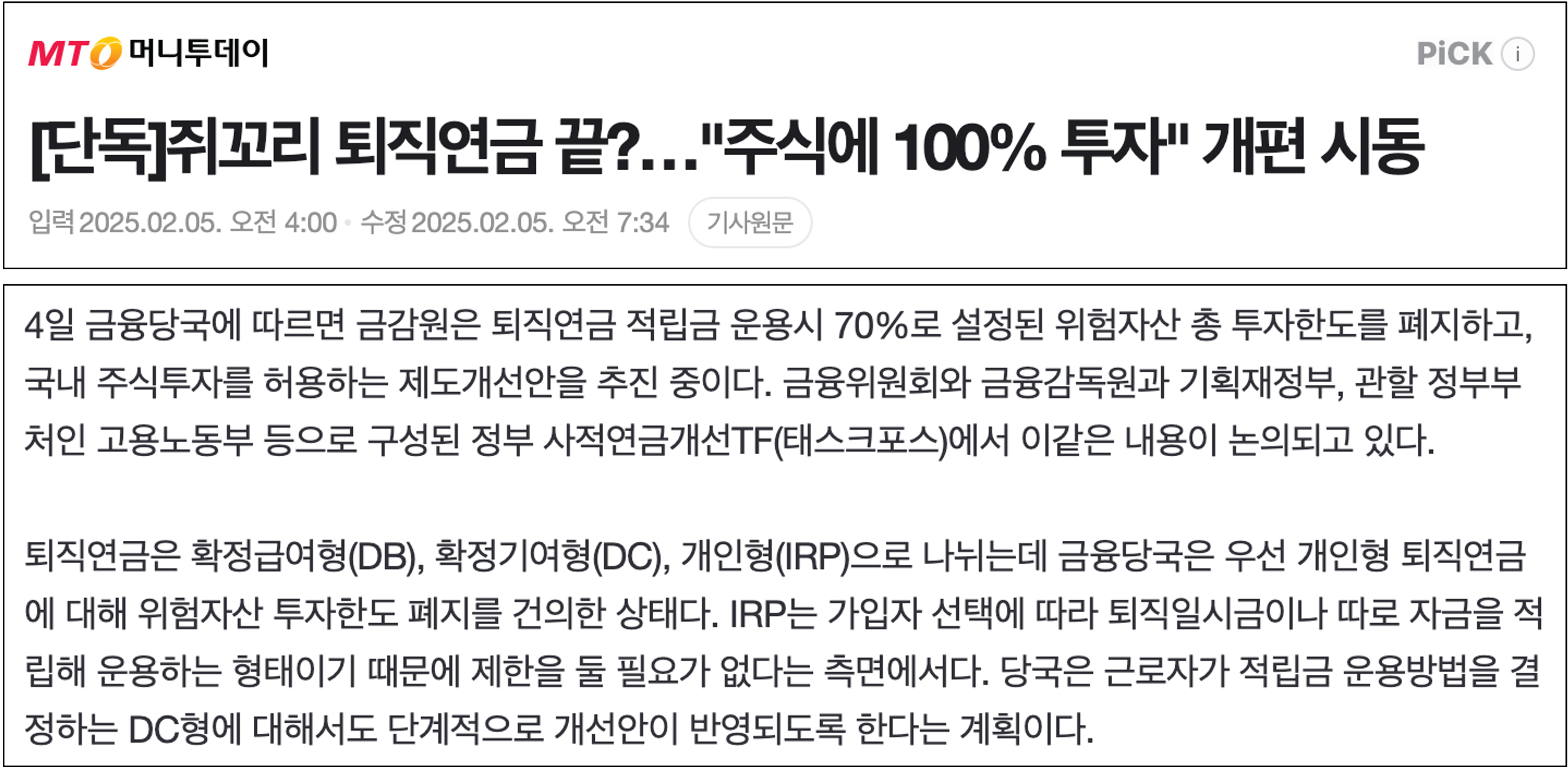 만약 기사 제목처럼 퇴직연금DC와 IRP에서